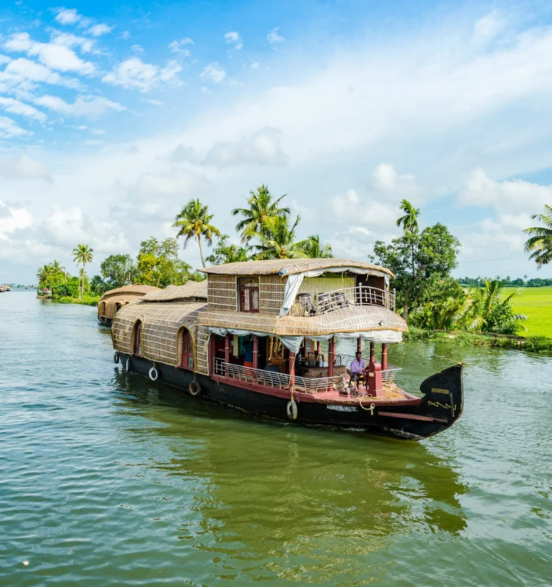 After breakfast, check out from the hotel and travel to Alleppey, also known as the Venice of the East. On arrival, board your beautifully decorated houseboat for an overnight backwater cruise. Check-in starts at 1:00 PM, followed by a tasty lunch on board. As the houseboat moves through calm backwaters, enjoy views of village life, green paddy fields, coconut trees, canals, temples, and local activities along the shore. Freshly cooked meals will be served on the houseboat. Relax and enjoy a peaceful overnight stay on the houseboat.